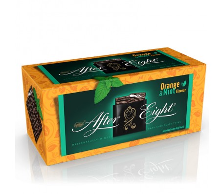 Шоколадови бонбони AFTER EIGHT® с тъмен шоколад и ментов пълнеж с вкус на портокал.