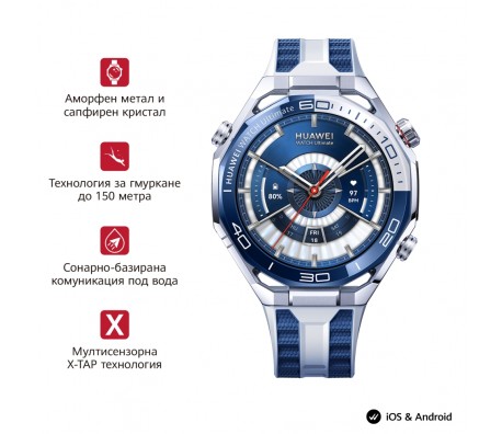 Часовник Huawei Watch Ultimate 2 March-B29 Blue + Huawei FreeBuds Pro 4 Piano-T180 Black Специална цена в комплект с Huawei FreeBuds Pro 4. Валидност до 04.11.2025г.