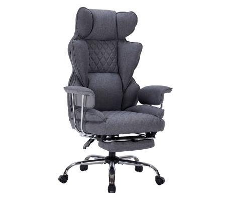 За още по-голям комфорт, столът разполага с вградена облегалка за глава, която поддържа шията и ви позволява да се отпуснете. Модерните хромирани подлакътници с меки падове придават изтънчен блясък и предлагат приятно усещане при допир.А когато имате нужда от почивка – просто разгънете удобната поставка за крака и се отпуснете напълно.