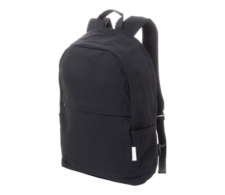 Раница от рециклиран плат с основно отделение с цип, подплатено отделение за лаптоп (15"), преден джоб с цип, странични джобове, презрамка за количка, подплатени гръб и презрамки. Със скрит джоб против кражба. 70% рециклиран памук и 30% RPET полиестер.