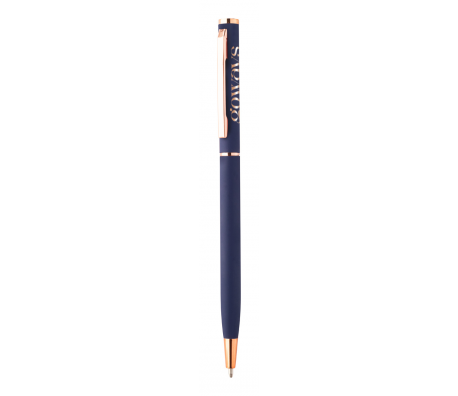 Химикалка от рециклиран алуминий с въртящ се връх, гумирано покритие и детайли от розово злато. Със специално покритие за огледално лазерно гравиране в цвят розово злато.