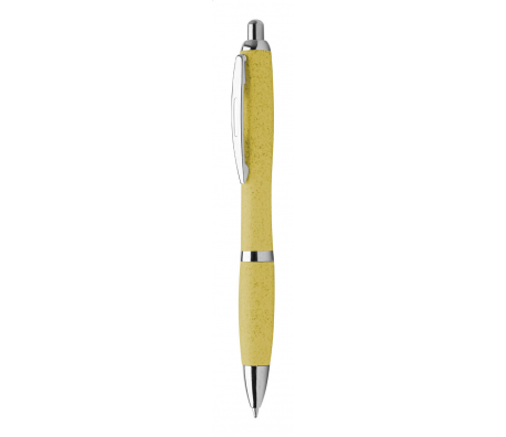 Химикалка с хромирани детайли и части от екологична пластмаса от пшенична сламка. Със син пълнител.