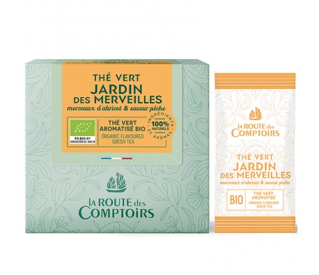 Био Зелен чай Градината на чудесата е зелен китайски чай, ароматизиран с кайсия, праскова и ревен.