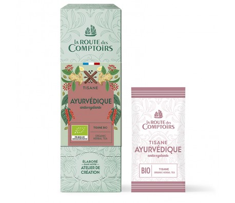 Здравословен Био Билков чай - Аюрведичен Антиоксидант представлява балансирана смес от подправки: цейлонска канела, джинджифил, черен пипер, кардамон и карамфил. Пикантните ѝ нотки създават успокояваща и топла чаша — идеална за момент на благополучие и вътрешен комфорт.