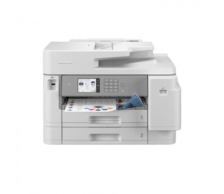 Професионално A4 цветно мастиленоструйно мултуфункционално устройство с възможност за A3 печат - Това професионално устройство съчетава в себе си бизнес функционалност с изгоден печат. Печатът до A3 формат и А4 автоматичното лисоподаващо устройство (ADF) за 50 листа правят копирането и сканирането бързи и удобни. С найновата технология на печатащата глава може да сте уверени, че това устройство ще е до вас, когато имате нужда. С големия капацитет на хартията до 500 листа, като стандарт вече не е нужно да губите време в постоянно презареждане на устройството, а да се концентрирате върху основното във вашия бизнес. С мултифункционалната тава за 100 листа може да ползвате различни видове хартия до 220gsm, това заедно с автоматичното листоподаващо устройство за 50 листа ви позволява бърз, удобен и изгоден А4/А3 печат и А4 сканиране. С множество бизнес функции и характеристики MFC-J5955DW предлага бърз и сигурен печат директно от вашето мобилно устройство чрез NFC свързаност. Настройте бързи опции за сканиране с интуитивния потребителски интерфейс за директно сканиране към желани офис приложения. 8.8 см цветен сензорен дисплей ви позволява следене нивото на мастилото на екрана.