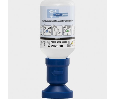 Разтвор за промивка с 4,9% стерилен фосфатен буфер, с неутрално pH. Предназначен за неутрализиране на киселинни и основи, предлагайки надеждна защита срещу сериозни наранявания на очите. Използвайки фосфатен буфер с доказана ефективност при лечение на очни наранявания, свързани с химикали, този разтвор се предлага в разфасовка от 200 мл. • Лесно се побира в чанти за инструменти или комплекти за първа помощ. • Бутилката разполага с ергономични чашки за очи за ефективна, но нежна струя, и удобен дизайн, който позволява бързо отваряне с една ръка. • Препоръчва се след използване да продължите промивка с Plum Eyewash 0.9% Sodium Chloride за пълноценна грижа. • Бутилките са еднократни, с маркировка CE и имат срок на годност от 3.5 години и могат да се използват самостоятелно или като пълнители за станциите и кутиите за разтвори за промиване на очи.