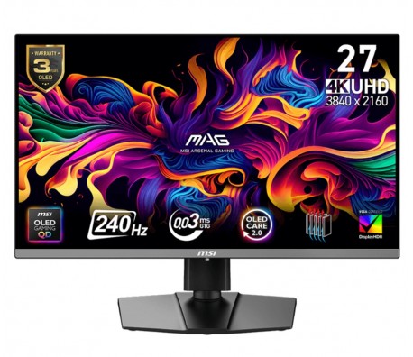 MSI MAG 272UP QD-OLED X24, 0.03ms, 240Hz, 3840 x 2160 (UHD), 16:9, NVIDIA G-SYNC, 99% DCI-P3, VESA DisplayHDR True Black 400, AG, DP(1.4a), 2xHDMI 2.1, TypeC (DP alt. w/15W PD), Pivot, Heigh Adj., VES
