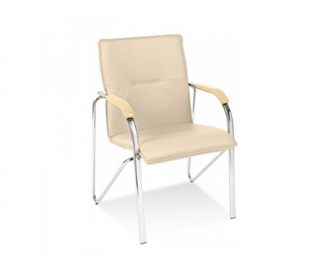 Samba е един от най - търсените модели посетителски и конферентни столове. И не е случайно. Така е, защото предлага удобство дори и при продължително седене. Едновременно с това може спокойно да се комбинира с повечето модели столове с хромирани елементи. Стилен посетителски стол, изработен от висококачествена еко кожа. Оборудван със здрава метална хромирана рамка, подлакътници с дървени падове в цвят бук, стифиране до 3 броя. Стол, подходящ за семинарна и конферентна зала, чакалня, за дома. Материал основа: метална основа с хромирано покритие Материал седалка: еко кожа Материал облегалка: еко кожа Материал подлакътници: хром + дърво Тегло на стола: 8 кг Тип стол: Посетителски Издръжливост в кг: 120 Цвят: слонова кост Тапицерия: Еко кожа Тип база (основа): Крака Подлакътници: Да