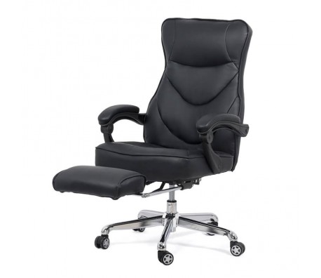 Стол ALVARO е удобен и практичен стол както за офиса, така и за дома. Притежава допълнителна опора за крака, при нужда от почивка в натоварения работен ден. А-синхронният механизъм на седалката позволява на потребителя да регулира височината, както и да се върти на 360 ° . Но основната функция е да сгънете облегалката под ъгъл от около 145° , като просто натиснете лоста под седалката. Тапицерията на модела е изработена от екологична кожа, лесна за поддръжка. Подлакътниците са подплатени и тапицирани с еко кожа. Основата на седалката е издръжлива, изработена от хромирана стомана, което прави продукта издържащ на тежести до 120 кг. Модерни сиви колелца допълват дизайна на модела. Цвят: черен Размерите му са: височина на стола: 110-103 см; височина на седене: 45-52 см; височина на облегалката: 68 см; ширина на седалката: 62 см; ширина x дълбочина на седалката: 53 x 53 cm.