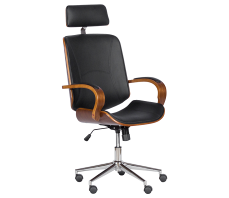 Директорският офис стол VINCENT се отличава с нестандартен и изискан дизайн. Комбинацията от дърво, хром и черна еко кожа придава стилен и елегантен вид на стол, а неговите извивки, подлакътниците и подглавник ще се погрижат за вашия комфорт