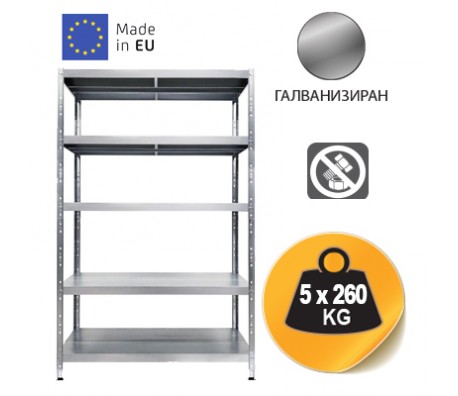 Размери: 195 х 120 х 60см Рафтове метални - 5 рафта с товароносимост 260 кг на рафт, общ капацитет 1300кг. Безболтов монтаж. Галванизиран.