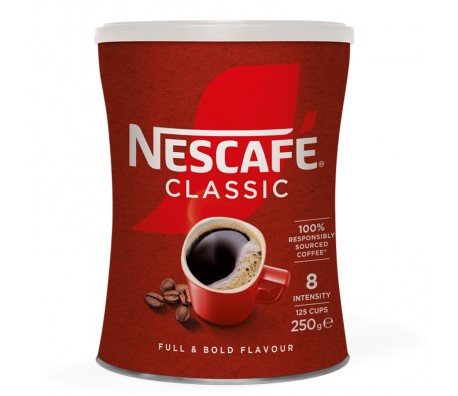 Разтворимо кафе NESCAFE CLASSIC Метална кутия, 250g Наслади се на NESCAFE Classic. NESCAFE Classic е разтворимо кафе, което се приготвя от екстракцията на подбрани кафе зърна Робуста, експертно изпечени до средно тъмно. Започни деня си с NESCAFE Classic. Продуктът е в метална кутия за 125 чаши ароматно NESCAFE. Отличим вкус, който познаваш и обичаш. Богат аромат и наситен кафе вкус. Направено от кафе на зърна Робуста, които са експертно изпечени до средно тъмно. Разтворимо кафе Наслади се на NESCAFE Classic. NESCAFE Classic е разтворимо кафе, което се приготвя от екстракцията на подбрани кафе зърна Робуста, експертно изпечени до средно тъмно. Започни деня си с NESCAFE Classic. Продуктът е в метална кутия за 125 чаши ароматно NESCAFE. Към 1-2 лъжички NESCAFE Classic добави 150 ml топла, но не вряла вода. При желание може да се добави мляко или захар.
